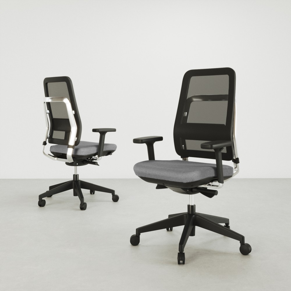 - Rückenlehne aus schwarzem Polyester-Netzgewebe mit einem Rahmen aus Polypropylen und 12 Prozent Glasfaser. Der freiliegende strukturierte Rahmen besteht aus Polypropylen und 25% Fiberglas in Schwarz.